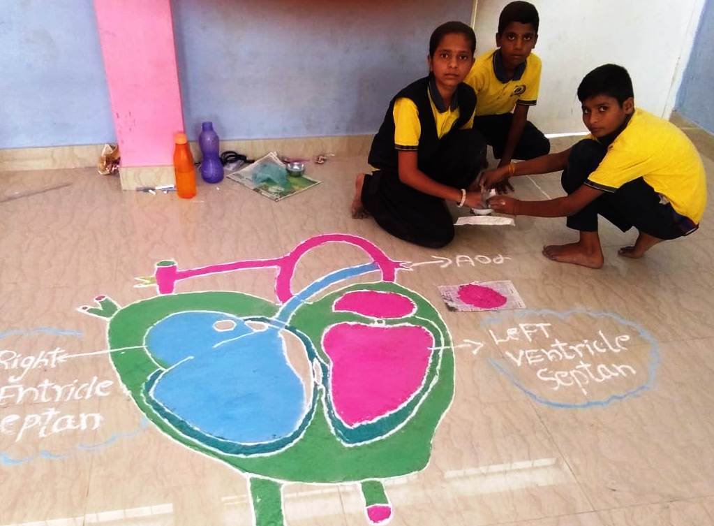 Education should never become stressful process for children so we give importance to learning through fun. Students had drawn 36 rangoli related to their core subjects.